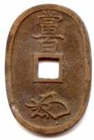 This large oblong bronze 100 Mon coin of Japan was struck from 1835 to 1870, a period of transition in Japan from the long ruling Shoguns to the modernization of the Meiji Restoration.