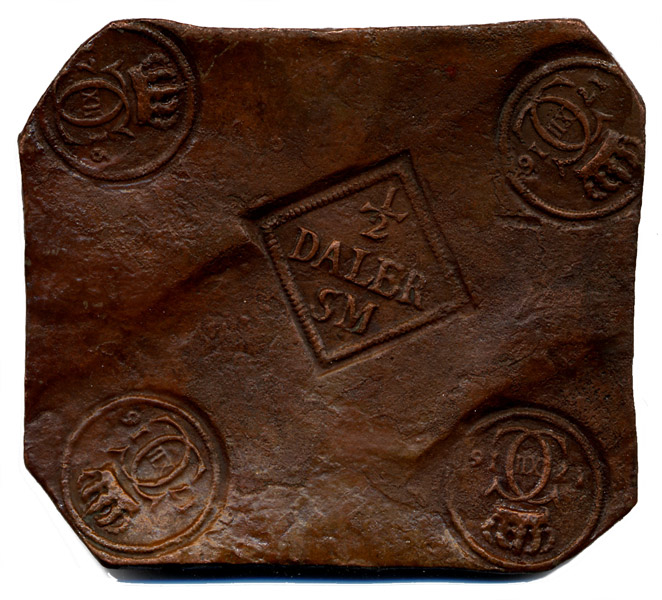 Эта медная монета изготовлена в 1716 году во время царствования Карла XII. С четырех сторон монеты находятся печати в виде двойной буквы "C" увенчанной короной, наложенные на дату. В Центре находится печать в виде ромба, окружающая надпись " 1/2 DALER S.M". Эту монету нашли в грузовом отсеке корабля "Никкобар" потопленного в 1782 году. Этот экземпляр один из немногих, которые не пострадали от морской соли или двигающегося песка. |